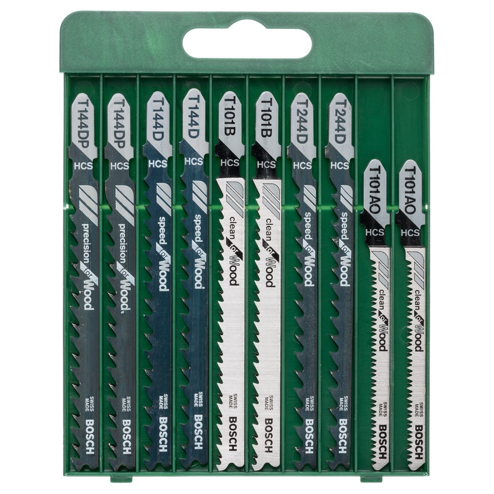 Contacteer onsTien decoupeerzaagbladen voor rechte en gebogen zaagsneden in hout. Enkelnokkenschacht Enkelnokkenschacht