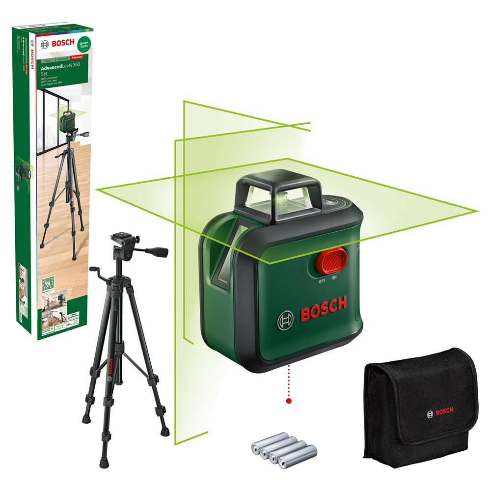 Allrounder voor goed zichtbaar precies uitlijnen, rechtzetten en overbrengen De AdvancedLevel 360 brengt alle benodigde referentiepunten in één toestel bij elkaar, als het gaat om eenvoudig en snel uitlijnen, rechtzetten en overbrengen. Precies uitlijnen is gewaarborgd door de projectie van de 360° horizontale laserlijn en de verticale lijn. De tweede verticale laserlijn in een hoek van 90° zorgt voor snel en exact rechtzetten. Het plafondkruis zorgt, als aanvulling op het loodpunt omlaag, voor snel overbrengen. Door groene laserlijnen is de zichtbaarheid tot wel 4 keer beter t.o.v. rode laserlijnen, zelfs bij fel licht. Of nu verlaagde plafonds gemonteerd, meubels op dezelfde hoogte gezet, gipswanden en douchecabines gemonteerd of lampen opgehangen moeten worden, de kwaliteiten van deze 360° lijnlaser garanderen optimale resultaten, zelfs bij gebruik op iets ruwe oppervlakken.
