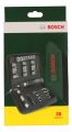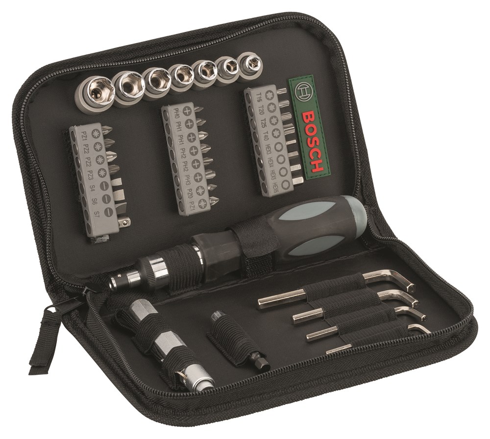 23 bits, L=25 mm; PH 0/1/1/2/2/3; PZ 0/1/1/2/2/3; S 4/6/7; HEX 3/4/5/6; T 15/20/25/40; 7 dopsleutels; Ø 5/6/7/8/10/11/13 mm; 4 binnenzeskantleutels 3/4/5/6 mm; 1 universeelhouder, magnetisch; 1 zaklamp; 1 handschroevendraaier; (rechts- en linksdraaien); 1 adapter voor dopsleutel