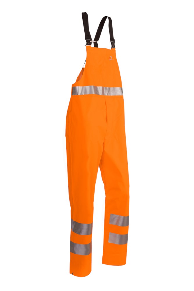 Contacteer onsGezien worden en droog blijven, dat is wat de Amberg doet. Deze comfortabele bavetbroek met borstbovenstuk beschermt u uitstekend tegen de meest gure weersomstandigheden dankzij de ondoordringbare Flexothane® stof. De fluorescerende kleur en de reflecterende tape rond de middel en beenuiteinden doen u opvallen. De beenuiteinden kunnen bovendien vernauwd worden d.m.v. drukknopen. Ook de gulp is voorzien van drukknopen. De soepele stof en de elastische bretels met PVC knopen en gespen zorgen ervoor dat u nooit gehinderd wordt in uw bewegingen.
