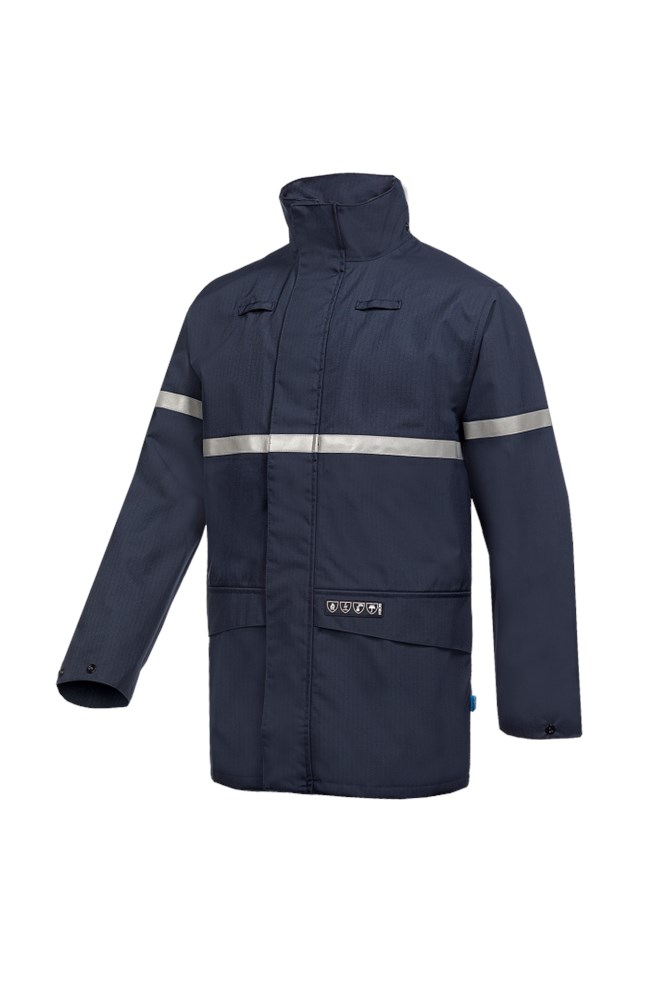 Contacteer onsDe Ridley, een sobere vlamvertragende en antistatische regenjas, biedt een degelijke bescherming. De gebruikte stof is perfect waterdicht en bezorgt u dankzij de ademende coating nooit een klam gevoel. De rechtopstaande kraag en de mouwvernauwingen d.m.v. drukknopen houden elk zuchtje wind tegen. De comfortabele regenjas is voorzien van 2 lussen, 2 ingezette zakken en 1 binnenzak. Daarenboven is er binnenin een speciale opbergzak voor een kap die u apart kunt aanschaffen. Deze jas is ook combineerbaar met 2 apart verkrijgbare fleece voeringen die ingeritst kunnen worden bij koudere omstandigheden. De regenjas is afgewerkt met een smalle reflecterende FR strook voor een verbeterde zichtbaarheid.