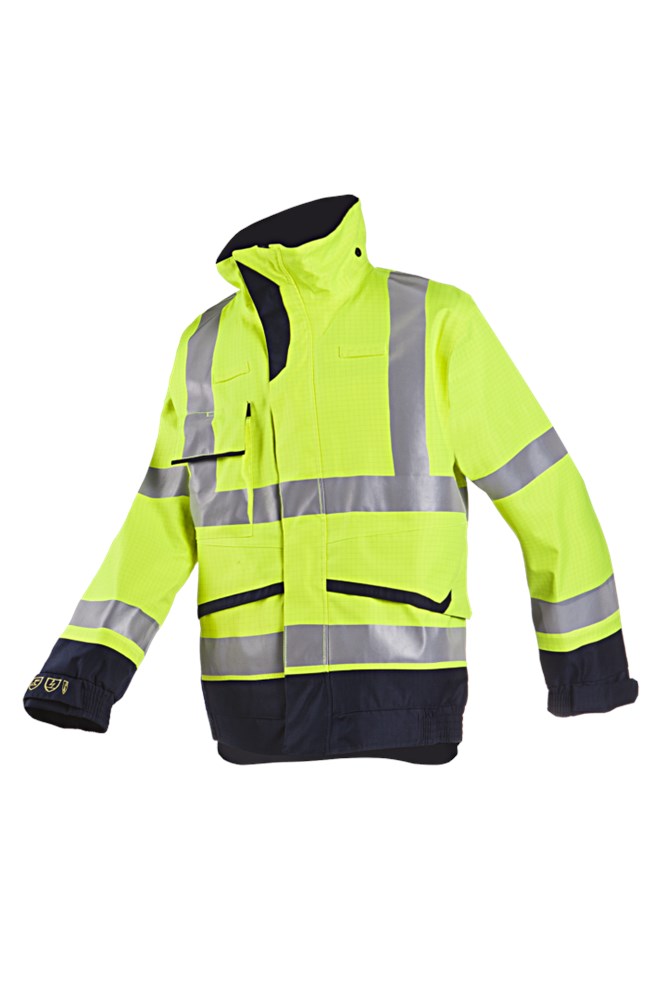 Contacteer onsDe Talbot is een vlamvertragende, antistatische signalisatie regenblouson in Siopor® Excell kwaliteit die niet alleen uitstekend beschermt tegen hitte en vlammen, maar ook tegen water en wind. Deze lichte regenblouson met reflecterende FR tape is extra comfortabel door het verlengd rugpand en de elastische taille die vernauwd kan worden. Bij koud weer kan ook een fleece met lange mouwen (Heflin) ingeritst worden. De wind wordt buitengehouden door de elastische polsbanden die vernauwd kunnen worden en door de rechtopstaande kraag waar een kap aan bevestigd kan worden. De apart verkrijgbare kap kan in de speciale binnenzak opgeborgen worden.