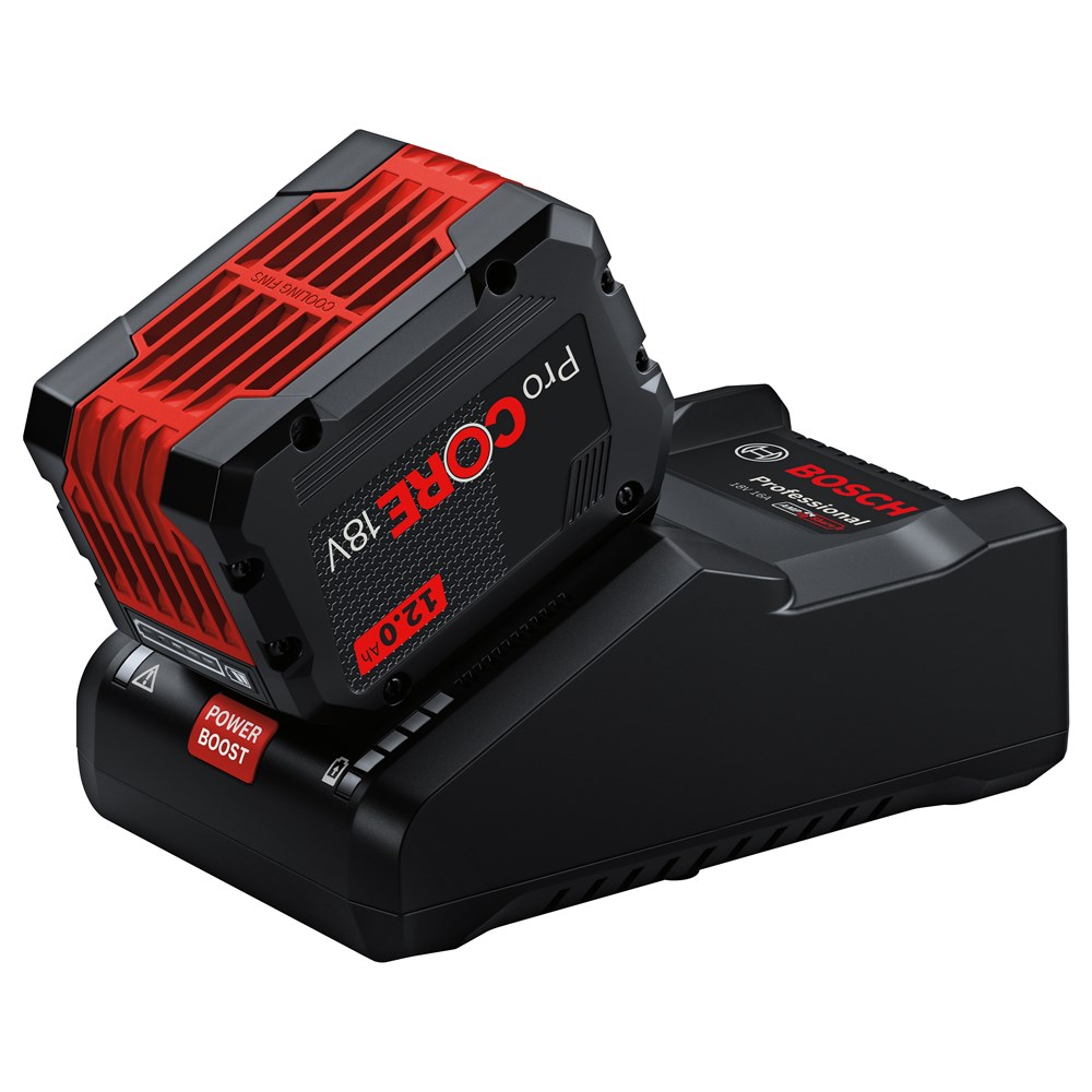 Deze set bestaat uit twee ProCORE18V 12.0Ah-accu's voor een vermogen dat gelijkwaardig is aan 2.000 W met snoer en de ultra-snellader GAL 18V-160 Professional. ProCORE18V 12.0Ah leveren extreme prestaties en looptijd met 87 % meer vermogen dan een gewone accu. Dit wordt gegarandeerd door een celtechnologie met 21.700 cellen en het slimme accumanagement van Bosch. Bovendien zijn de accu's uitgerust met de COOLPACK 2.0-technologie voor een superieur hittemanagement. Dit resulteert in een langere levensduur en looptijd van de ProCORE18V-accu's. De GAL 18V-160 Professional is onze ultrasnelle 18V-oplader. Deze wordt geleverd met een Standard-modus en aanvullende oplaadmodi om uw productiviteit te verhogen en tijd te besparen. Dankzij een laadstroom van 16 ampère duurt het slechts 22 minuten om uw ProCORE18V 12.0Ah-accu's op te laden naar 50 % en 55 minuten voor een volle lading.