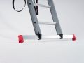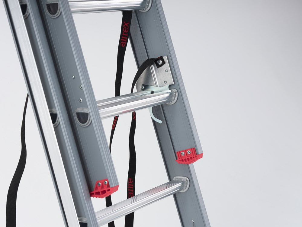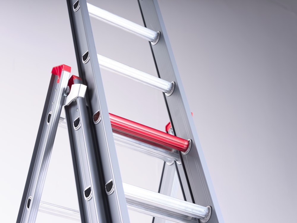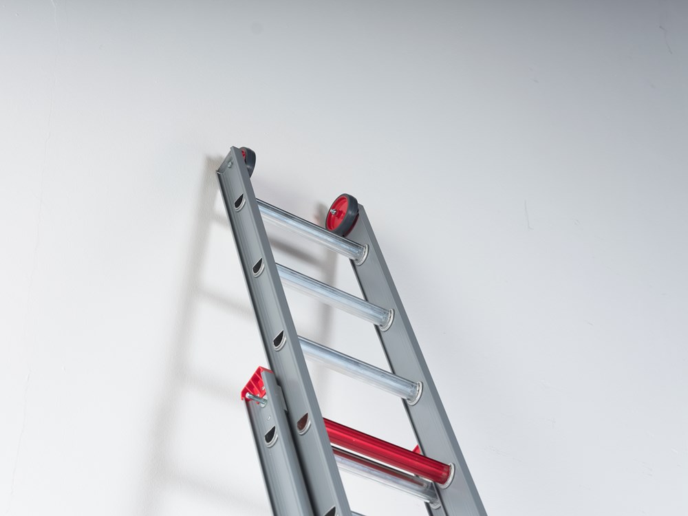 De unieke D-sport zit door de speciale vorm stevig op zijn plek. Bovendien geeft het brede oppervlak je meer stacomfort en met de stabiliteitsbalk (bij 3-delige uitvoering) sta je extra stabiel. De opsteekhaak met veiligheidspal voorkomt dat je ladder in schuifstand ongewild inschuift. De drukvaste spreidbeveiliging doet datzelfde in A-stand. De kenmerkende grijze coating is naast mooi ook nog eens vuilafstotend.