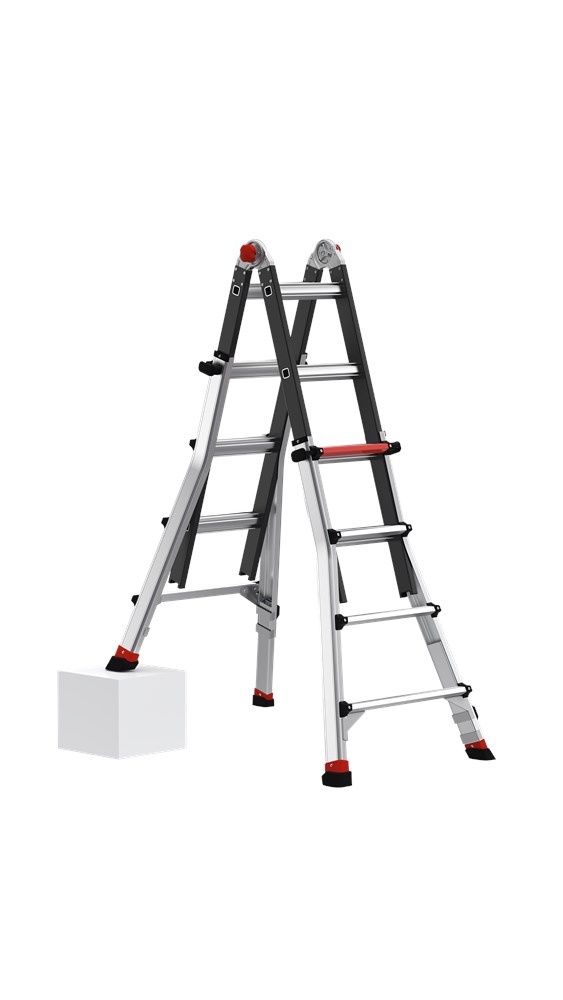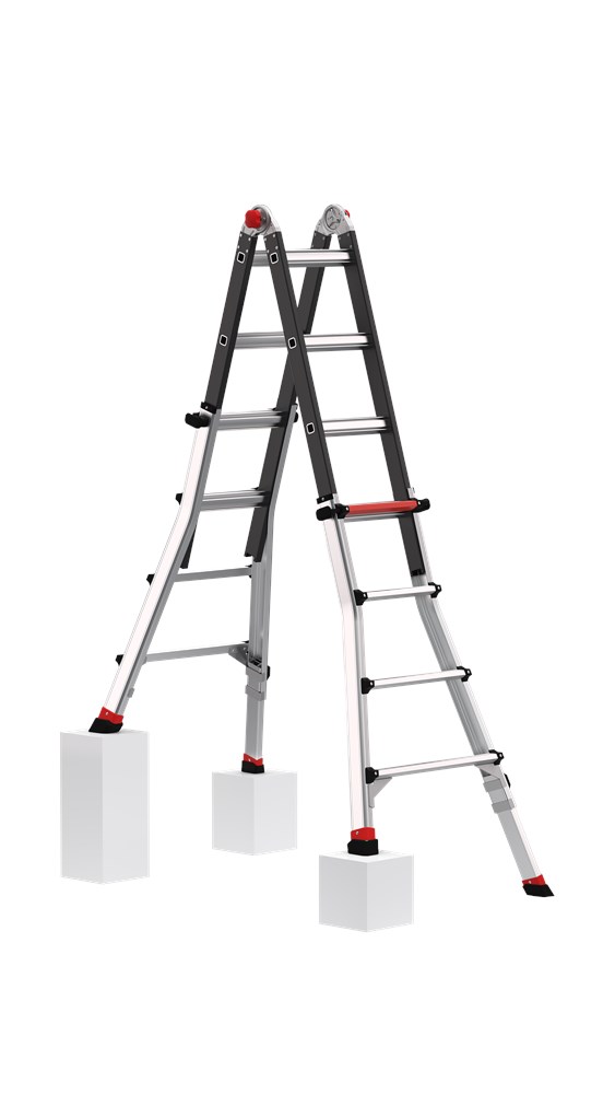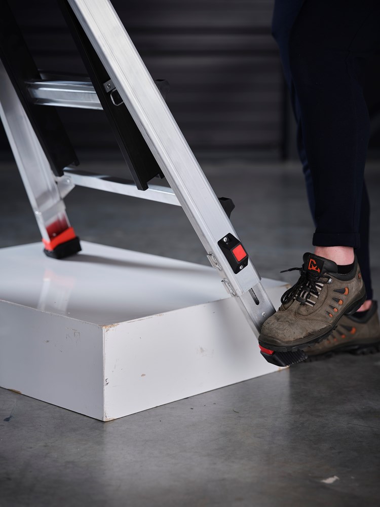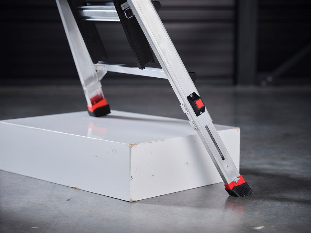 Flexibel telescopisch instelbaarDankzij het unieke telescopische systeem met twee individueel verstelbare laddervoeten aan één kant, kun je de ladder optimaal aanpassen aan ondergronden van verschillende hoogtes. Eenvoudig uit te schuiven met je voet. Met een maximale uitschuiflengte van 190 millimeter en automatisch vergrendelende stappen van 6 millimeter, is de ladder uitermate flexibel en zelfs veilig te gebruiken op de meeste gedraaide vaste trappen.