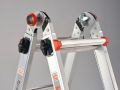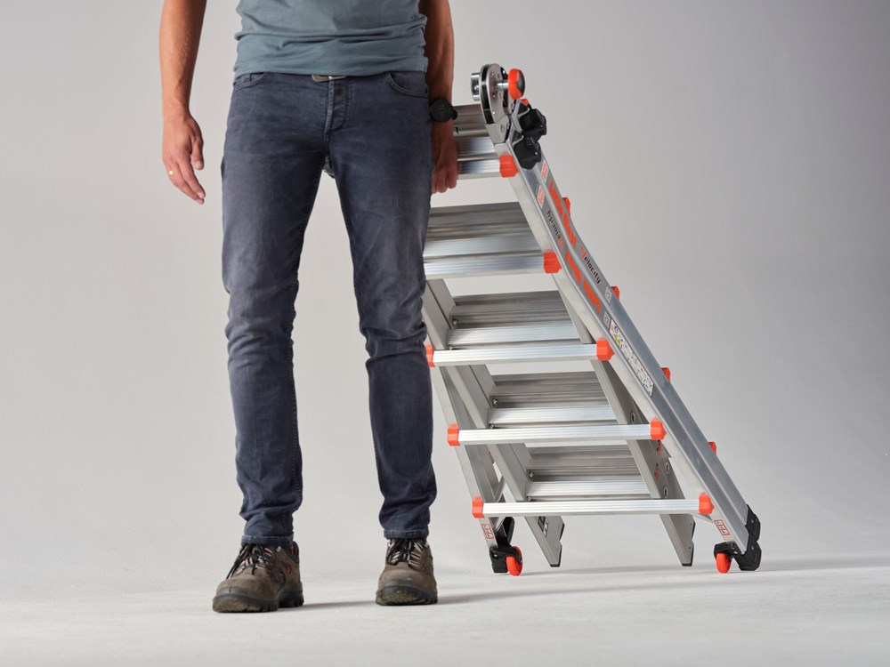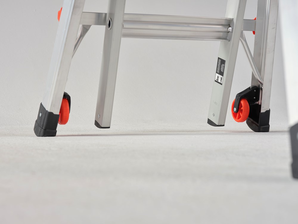 Compact op te bergenIngeschoven neemt de vouwladder weinig ruimte in. Zo past hij in elke bus. Bovendien transporteer je hem eenvoudig door de wielen.