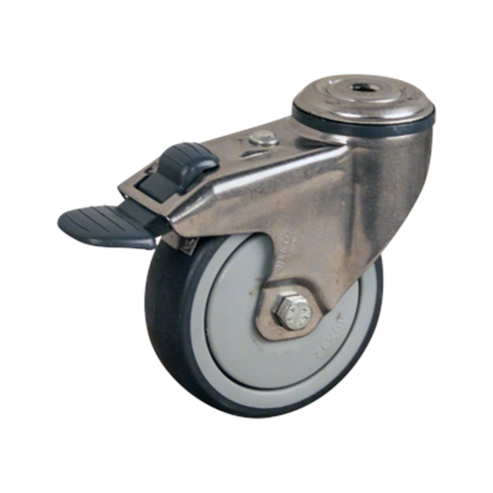 Apparatenwiel (zwenk) met boutgat, dubbele rem naloop met rvs gaffel, wiel met grijze PP velg met TPE band