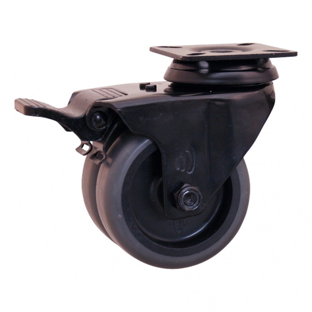 Apparatenwiel (zwenk) met plaatbevestiging, dubbele rem naloop met stalen gaffel, wiel met zwarte PP velg, TPE band