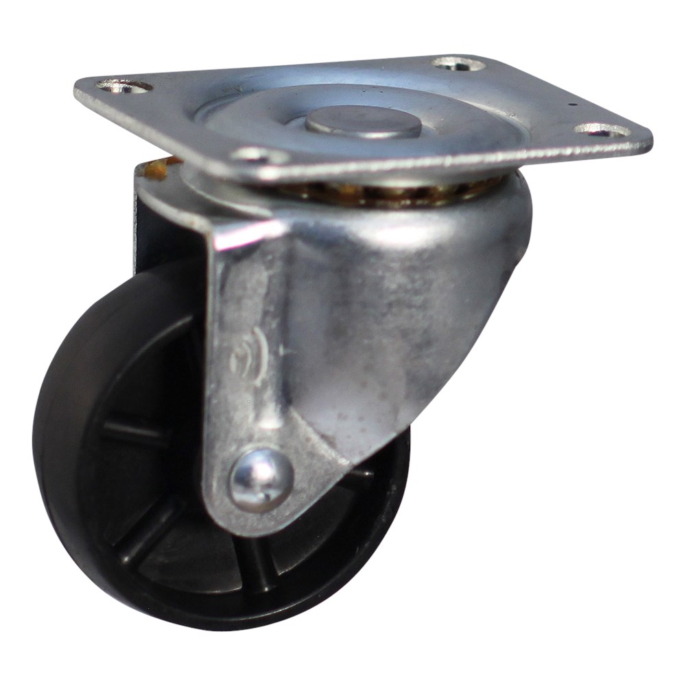 Apparatenwiel (zwenk) met plaatbevestiging met stalen gaffel, zwart PP wiel
