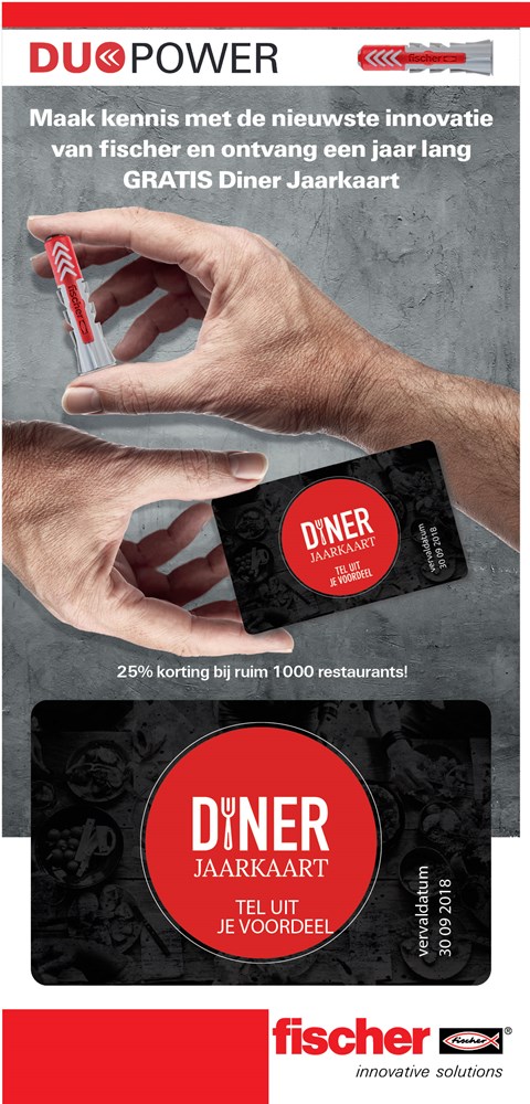 Contacteer onsMaak kennis met de nieuwste innovatie van fischer en ontvang een jaar lang GRATIS de Diner Jaarkaart.