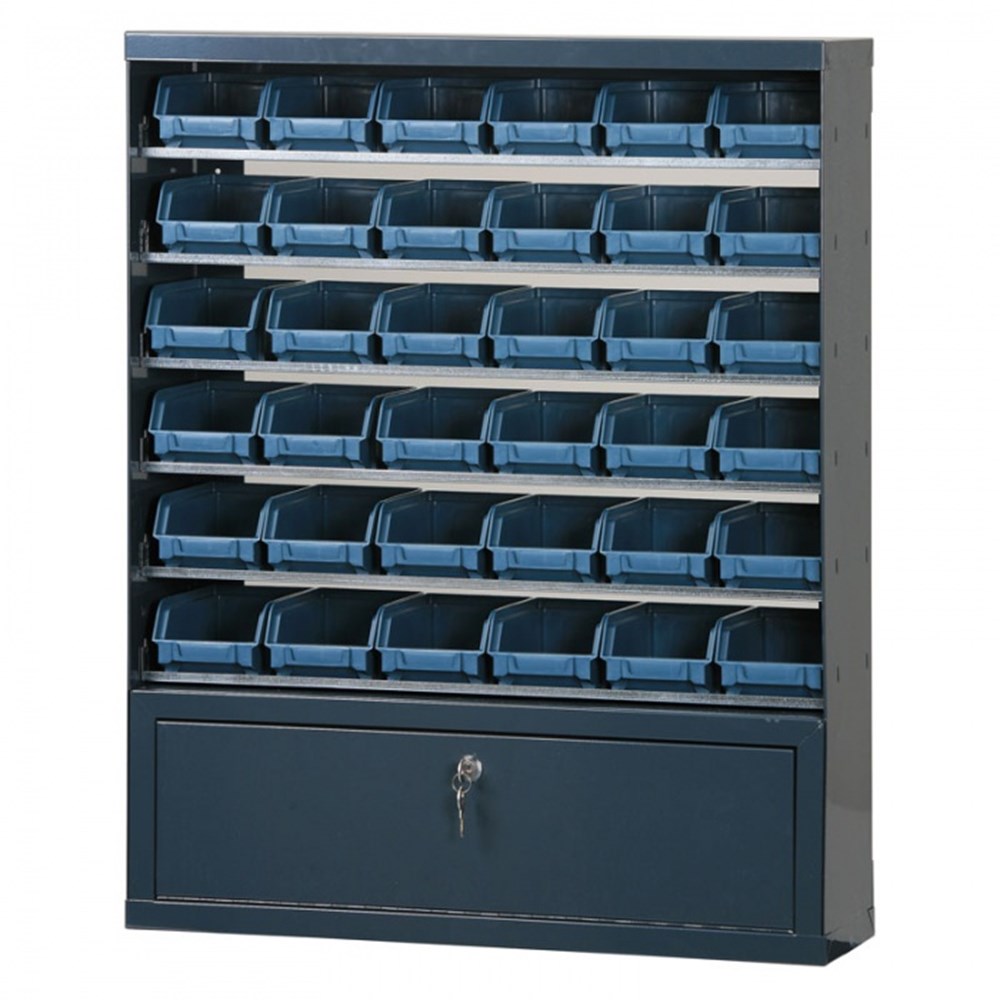 Contacteer onsStevige plaatstalen gelakte kast met afsluitbare onderbak. Compleet geleverd met kunststof magazijnbakken in de kleur petrol blue/avio. Incl. 36 bakken type 20702 afm.: 640 x 187 x 800 mm