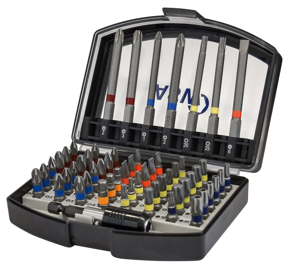 • 1 x PH1 x 25 mm • 2 x PH2 x 25 mm • 1 x PH3 x 25 mm • 1 x PZ1 x 25 mm • 2 x PZ2 x 25 mm • 1 x PZ3 x 25 mm • 1 x SL4,5 x 25 mm • 1 x SL6,5 x 25 mm • 1 x SW3 x 25 mm • 1 x SW4 x 25 mm • 1 x SW5 x 25 mm • 1 x SW6 x 25 mm • 1 x TX10 x 25 mm • 2 x TX15 x 25 mm • 2 x TX20 x 25 mm • 2 x TX25 x 25 mm • 1 x TX27 x 25 mm • 1 x TX30 x 25 mm • 1 x TX40 x 25 mm • 1 x TXR10 x 25 mm • 1 x TXR15 x 25 mm • 1 x TXR20 x 25 mm • 1 x TXR25 x 25 mm • 1 x TXR30 x 25 mm • 1 x TXR40 x 25 mm • 1 x magn. Bithouder