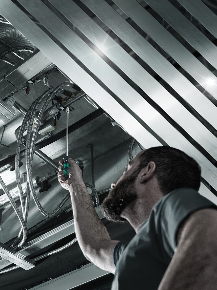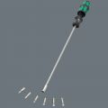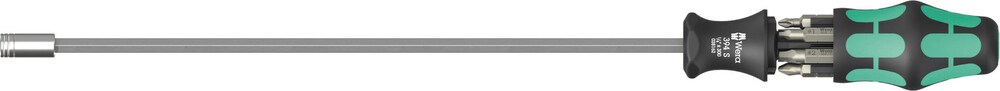 Bit-set voor universeel gebruik. Bithandhouder met 300 mm lange kling en zeer slanke, vergrendelbare bitopname om lastig te bereiken plaatsen te kunnen bereiken. Dankzij de slanke constructie kunnen hiermee ook schroeven op zeer beperkte inbouwsituaties worden bediend. Meercomponenten Kraftform handgreep voor snel en ergonomisch schroeven. In de handgreep geïntegreerde houder voor opbergen van de bits. 6 taaiharde, 25 mm lange bits (kruiskop Phillips, Pozidriv en TORX®). Zo vervangt deze set een 6-delige schroevendraaierset en reduceert de vereiste uitrusting tot een minimum. Met zeskantige wegrolbescherming tegen wegrollen.