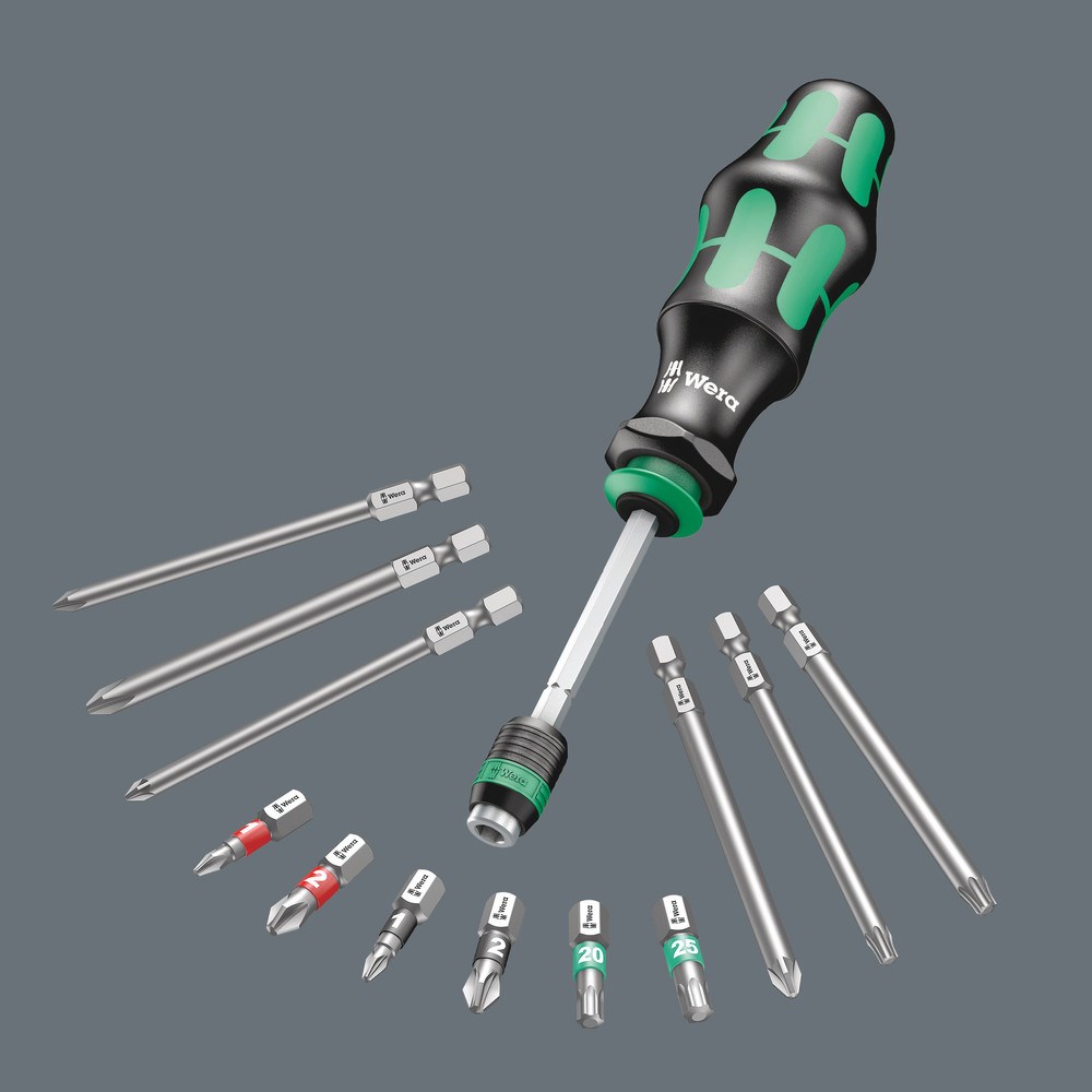 13-delige Kraftform Kompakt set met 6x 25 mm lange en 6x 89 mm lange bits. Het Wera Kompakt gereedschap kan zowel handmatig als machinaal worden gebruikt. Het handgreep/wisselkling-systeem in compact formaat met verschillende klingpunten compact verpakt biedt de gebruiker mobiliteit en flexibiliteit. Geschikt voor bits met 1/4" buitenzeskant-aandrijving conform DIN ISO 1173-C 6,3 en E 6,3 (ISO 1173) en Wera aansluiting serie 1 en 4. Met verbindingselement, bajonet, ‘Rapidaptor’ technologie. Kraftform handgreep met wegrolbescherming, meercomponenten greep voor optimaal, ergonomisch verantwoord schroeven. In de handgreep geïntegreerde bit-houder, waarin 25 mm lange bits kunnen worden opgeborgen. Deze set vervangt een 12-delige schroevendraaierset en reduceert de vereiste uitrusting tot een minimum. Profiel en maat van de bits zijn dankzij de Wera ‘Take it easy’ Toolfinder met kleurcodering en uitstekend leesbare maatcode snel te vinden.