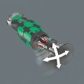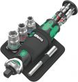Compacte Zyklop ratel met bitmagazijn die makkelijk in een broekzak te steken is. Magnetische directe bevestiging voor 1/4" bits en 3/8" doppen. Gereedschap uiterst snel te wisselen omdat het niet wordt vergrendeld. Dankzij de op 0°, 15° en 90° instelbare kop kan het gereedschap worden gebruikt als ratel en ratelschroevendraaier. De fijne vertanding met 72 tanden maakt een kleine terughaalhoek van slechts 5° mogelijk. Veelzijdig inzetbaar dankzij 12 in de handgreep geïntegreerde bits. Het robuuste ratelmechanisme zorgt voor een voldoende hoog draaimoment. Perfecte combinatie van een Zyklop ratel en een 12-delige schroevendraaierset. De 75 mm lange universele houder voor 1/4" bits kan als verlengstuk gebruikt worden. Inclusief doppen in gangbare maten. 1 robuust stoffen riemetui 9468 voor bevestiging aan broekriem; ook geschikt voor bevestiging aan het Wera 2go System.
