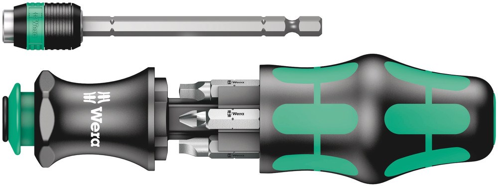 Het Wera Kompakt-gereedschap kan zowel handmatig als machinaal worden gebruikt. Het handgreep/wisselkling-systeem in compact formaat met verschillende klingpunten compact verpakt biedt de gebruiker mobiliteit en flexibiliteit. Geschikt voor bits met 1/4" buitenzeskant-aandrijving conform DIN ISO 1173-C 6,3 en E 6,3 (ISO 1173) en Wera aansluiting serie 1 en 4. Met verbindingselement, bajonet, Rapidaptor-technologie. Kraftform-handgreep met wegrolbescherming, meerdelig voor zo optimaal mogelijk ergonomisch verantwoord schroeven. Geïntegreerde houder voor opbergen van bits. De in de handgreep verzinkbare bajonetkling met snelwisselfunctie maakt een snelle handbediening mogelijk, ook op plekken waar weinig ruimte is, met ingetrokken kling. Om de kling uit te klappen, hoeft slechts de vergrendelhuls te worden bediend. De bajonethouder is nu weer te gebruiken als volwaardige schroevendraaier. De bajonetkling kan worden verwijderd en worden toegepast als machine-adapter of in de uitgangspositie terug worden gezet. Met handig riemetui.