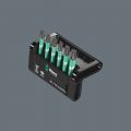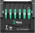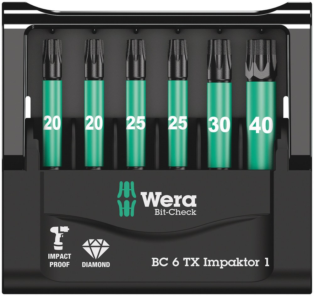 6 Wera Impaktor-bits, overzichtelijk en compact gerangschikt in handige Bit-Check. Bij de Impaktor-technologie wordt zo optimaal mogelijk gebruik gemaakt van de materiaaleigenschappen en is de geometrie volledig aangepast om langdurig gebruik mogelijk te maken, zelfs onder extreme werkomstandigheden. De bitpunt is voorzien van minuscuul kleine diamantdeeltjes die zorgen voor een hogere wrijvingsweerstand en zo het risico op wegglijden uit de schroef verkleinen.