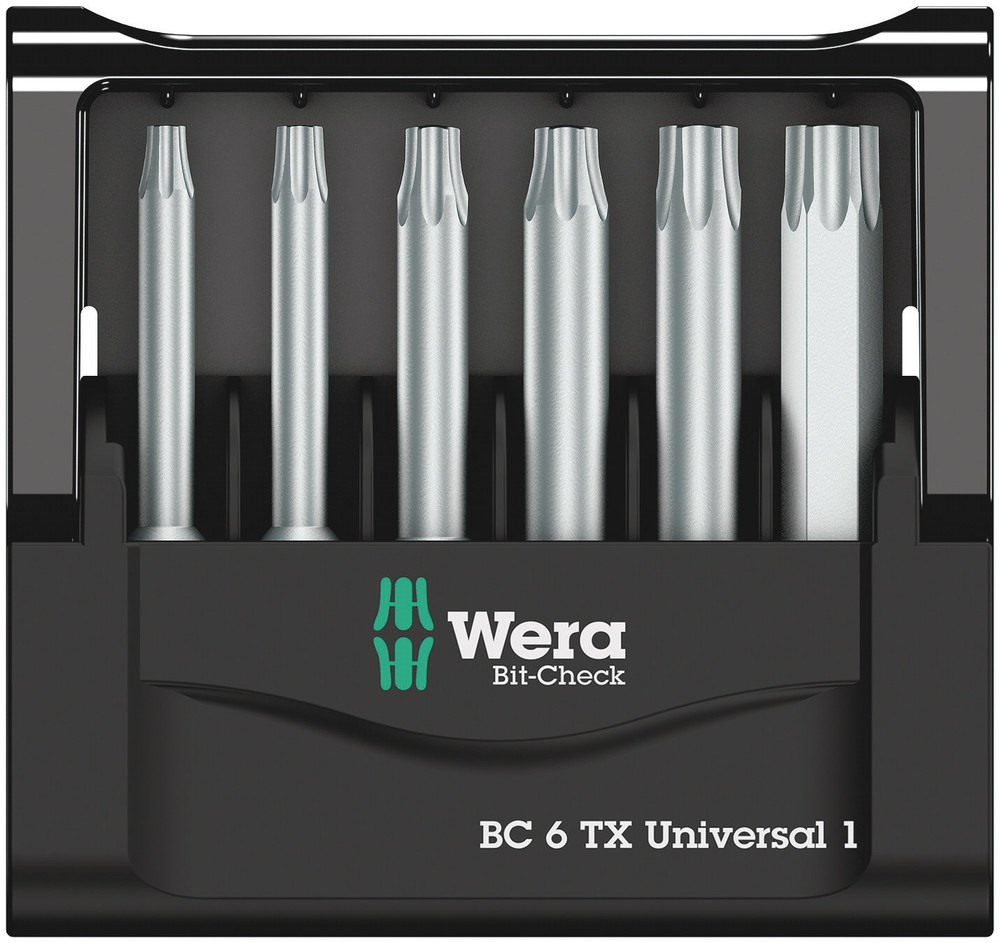 6 50 mm lange Wera TORX® bits, overzichtelijk en compact gerangschikt in handige Bit-Check. Met extreem harde bits, voor universeel gebruik.