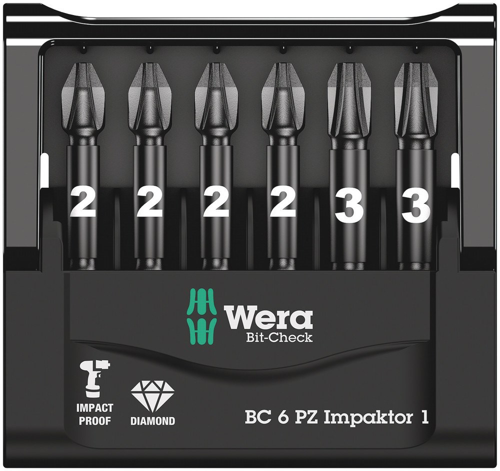 6 Wera Impaktor-bits, overzichtelijk en compact gerangschikt in handige Bit-Check. Bij de Impaktor-technologie wordt zo optimaal mogelijk gebruik gemaakt van de materiaaleigenschappen en is de geometrie volledig aangepast om langdurig gebruik mogelijk te maken, zelfs onder extreme werkomstandigheden. De bitpunt is voorzien van minuscuul kleine diamantdeeltjes die zorgen voor een hogere wrijvingsweerstand en zo het risico op wegglijden uit de schroef verkleinen.