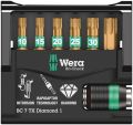 Bits met minuscule diamantdeeltjes op bitpunt. Deze zorgen voor een veilige grip op de schroef, verkleinen de vereiste aandrukkracht en reduceren het risico op wegglijden. BiTorsion-bits met torsiezone, waarin bij belastingspieken kinetische energie wordt afgeleid. Met zachte BiTorsion-zone om torderen van de bit-punt bij hoge belastingen te voorkomen. Hierdoor wordt de levensduur van het product aanzienlijk hoger. Voorzien van Rapidaptor-technologie, om de bits te kunnen plaatsen zonder daartoe de huls te moeten bedienen. Om de bits weer te verwijderen, hoeft u de huls slechts naar voren te schuiven - zo kunt u bits zelfs met 1 hand razendsnel wisselen. Voor plaatsing in de schroefboormachine of in boorkop van een elektronisch geregelde boormachine. De meerdelige Bit-Check overtuigt door het lage gewicht en uitstekende compactheid. Daarbij zorgt het zachte materiaal in het onderste gedeelte van de Bit-Check voor een betere houvast voor de bits en maakt tegelijk het uitnemen daarvan makkelijker. Het profiel en het formaat van de bits zijn gemakkelijk te herkennen dankzij de Wera 'Take it easy'-Toolfinder met kleurcodering en duidelijk zichtbare beschrijving.
