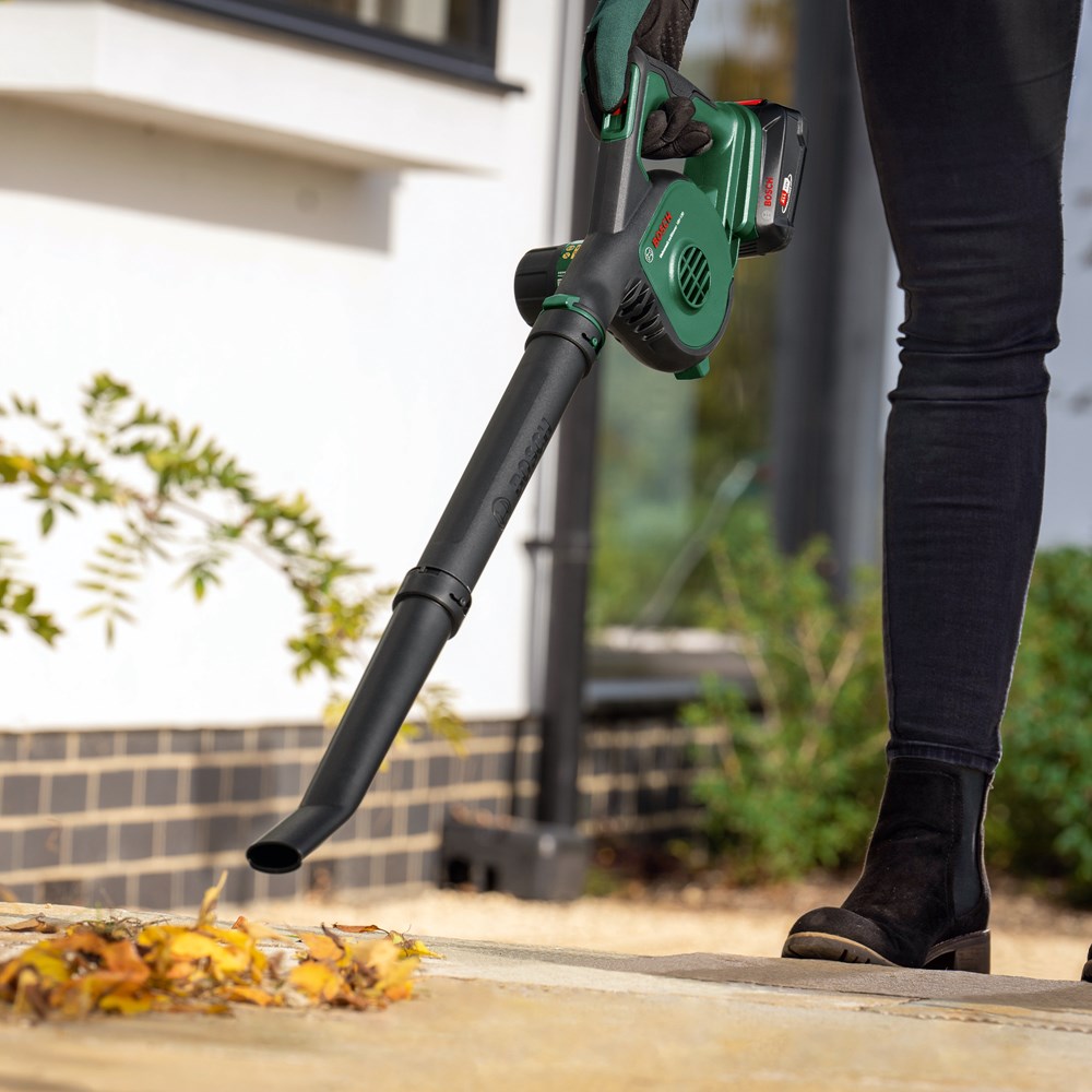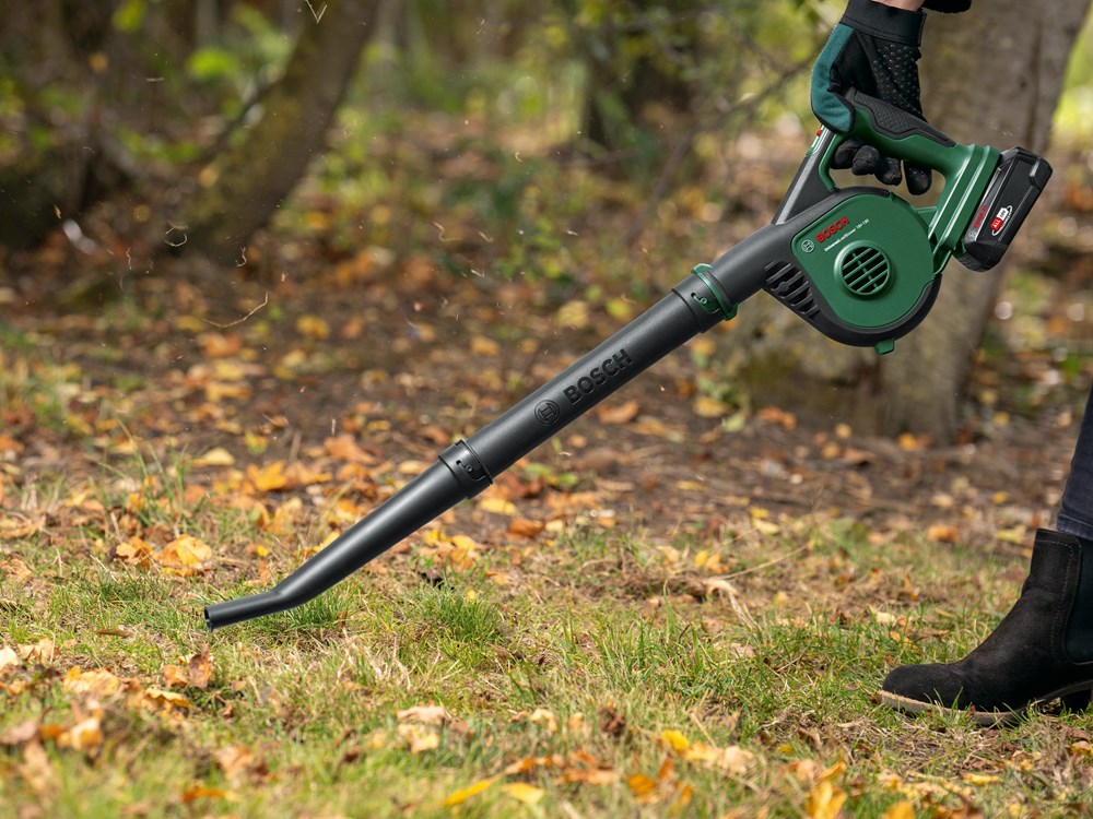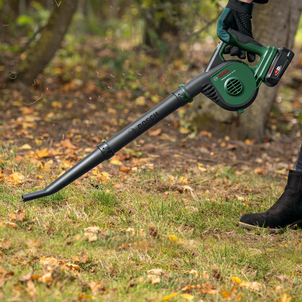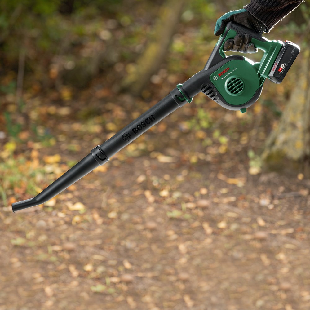 Lichte en compacte accublazer om bladeren en afval op te ruimen voor een nette tuin Verwijder tuinafval gemakkelijk met de snoerloze UniversalLeafBlower 18V-130. De lichte en compacte blazer heeft een ergonomische handgreep en kan gemakkelijk naar de verste uithoeken van de tuin worden gedragen. Deze beschikt over een eenvoudige schakelaar met 2 toerentalstanden om de luchtstroom te regelen voor krachtig en gecontroleerder opruimen. De Bosch 18V POWER FOR ALL-accu en Syneon Technology leveren een indrukwekkende luchtstroomsnelheid van 245 km/h voor snelle en krachtige prestaties. De vele mondstukken zorgen voor veelzijdige flexibiliteit bij het opruimen van de tuin. De bladblazer is eenvoudig in elkaar te zetten en compact op te bergen en doet opgeladen 18 minuten lang zijn werk. De geïntegreerde Bosch Syneon-elektronica beschermt uw machine en accu. Het gereedschap maakt deel uit van het 18V POWER FOR ALL-systeem. Eén accu kan worden gebruikt voor alle 18V POWER FOR ALL-gereedschappen.