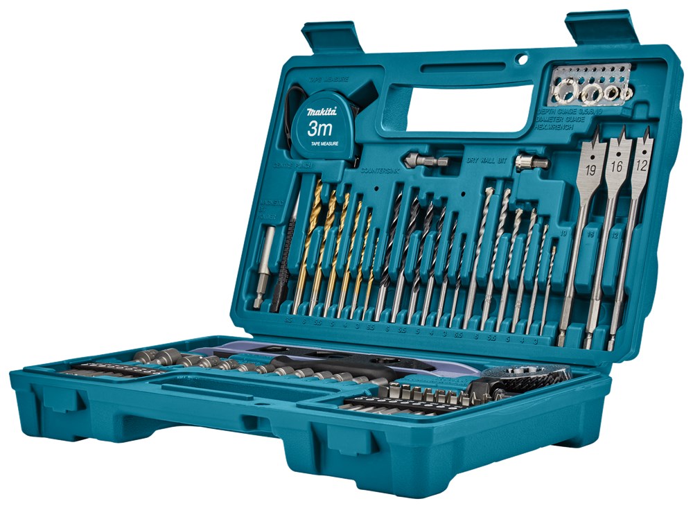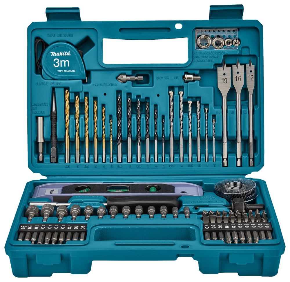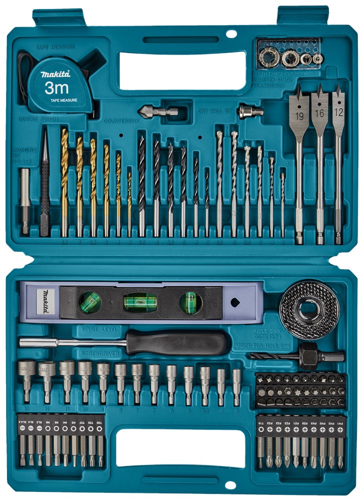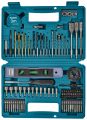 Contacteer onsMakita 102-delige boor-/schroefbitset in kunststof koffer bestaande uit een 50-delige schroefbitset, 21-delige borenset, 13-delige doppenset en 18 diversen waaronder een rolmaat en een waterpas.