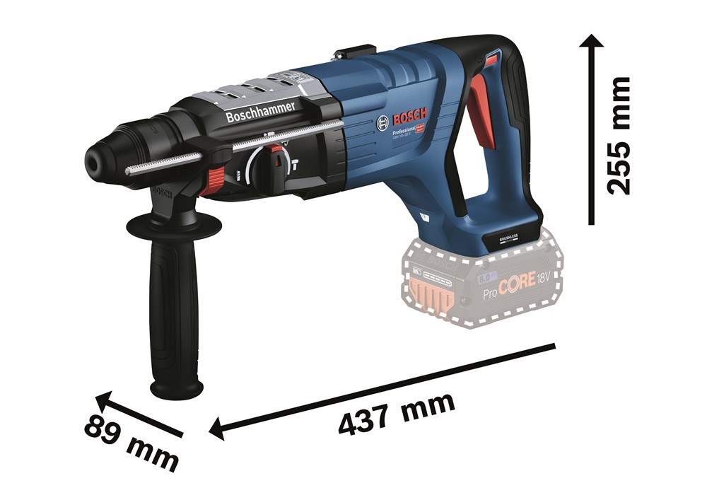 De GBH 18V-28 DC Professional is de krachtpatser van Bosch in de klasse boorhamers met spadehandgreep: de machine levert krachtige prestaties, is zelfs sterker dan de GBH 2-28 met snoer, met de borstelloze motor die een slagenergie van 3,4 J levert en een geoptimaliseerde vermogen-gewichtverhouding van 1,1 J/kg. Voor zeer comfortabel, stofvrij boren kan de extra en extreem lichte stofafzuiging GDE 28 D Professional met mechanische filterreiniging voor een constant afzuigvermogen gemakkelijk worden bevestigd. Daarnaast biedt de GBH 18V-28 DC Vibration Control en KickBack Control, een functie die plotseling verlies van controle over de machine detecteert. In het geval van bijv. een vastgeklemde boor schakelt deze functie de boorhamer uit om hand- en armletsel tot een minimum te beperken.