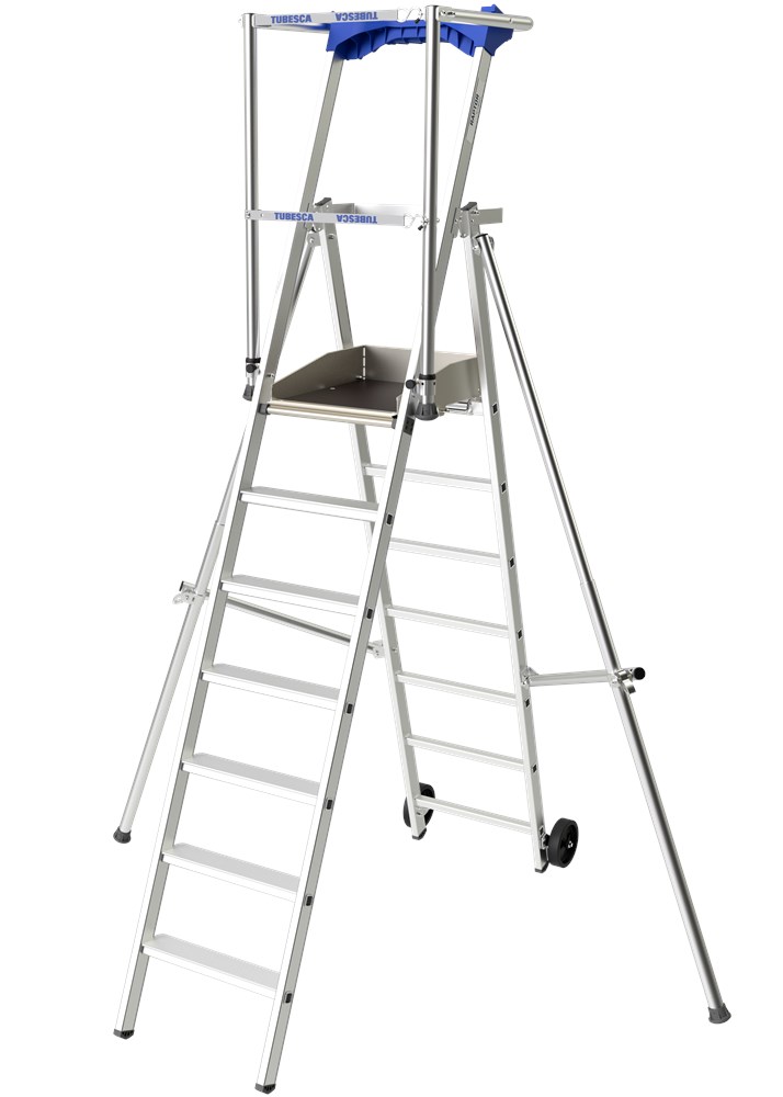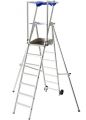 Contacteer onsInklapbare en verrijdbare bordestrap met achterframe dat over kleine obstakels kan worden geplaatst. Voorzien van groot anti-slip platform (500 x 400 mm) met schoprand en leuning rondom. Standaard met 80 mm diepe anti-slip treden, wielen Ø 100 mm en een tooltray voor materialen en gereedschap. Vanaf 5 treden voorzien van in-/uitklapbare stabilisatoren, kleinere modellen met 2 vaste stabilisatoren.