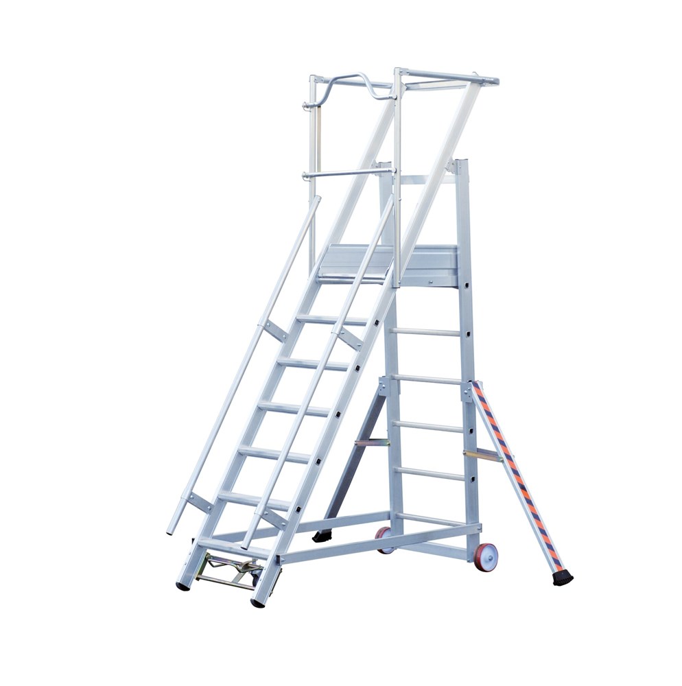 Stevige en veilige bordestrap dankzij het automatische hefboomrem systeem en de opvallend gekleurde stabilisatoren. Het bordes van 480 x 600 mm heeft een aluminium schoprand en leuning rondom. Het toegangshekje valt automatisch dicht om te voorkomen dat u achterover valt na het het betreden van het platform. De trap is voorzien van 10 cm diepe treden en leuningen over de gehele lengte van de trap voor een veilige opgang.