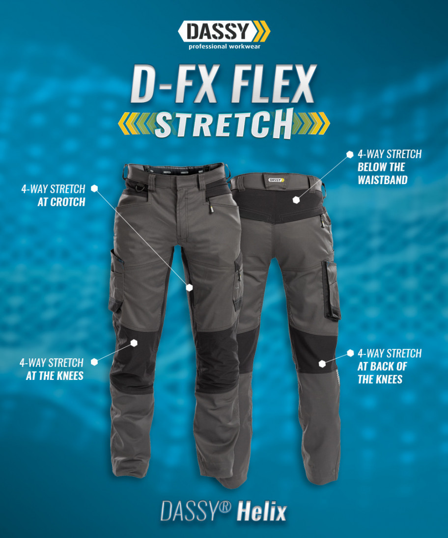 Contacteer onsModerne, flexibele werkbroek met een hoofdstof met mechanische stretch en 4-weg stretch-inzetstukken in het kruis, in de taille, aan de knieën en in de knieholtes. Ervaar het comfort van deze lichte werkbroek zonder in te boeten aan functionaliteit, dankzij de praktische en goedgepositioneerde zakken. Extra troef van de DASSY® HELIX? Door de extra stretch sluit de pasvorm perfect aan rond het lichaam. De combinatie met ingewerkte achterzakken zorgt voor een moderne, strakke uitstraling.