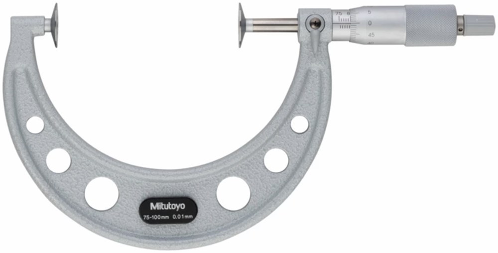 Een analoge schroefmaat met schotelvormige bekken voor het meten op bijvoorbeeld tandwielen. een ratelstop zorgt voor repeteerbare metingen.