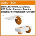 Material: Eternit®, Swisspearl®, Fermacell®, Ivarplank®, HardiePlank®, HardiePanel®, spaanplaat, MDF, Corian®, Duroplast®, Formica®, cementgebonden plaat, gipsplaat en thermoplastische kunststoffen.