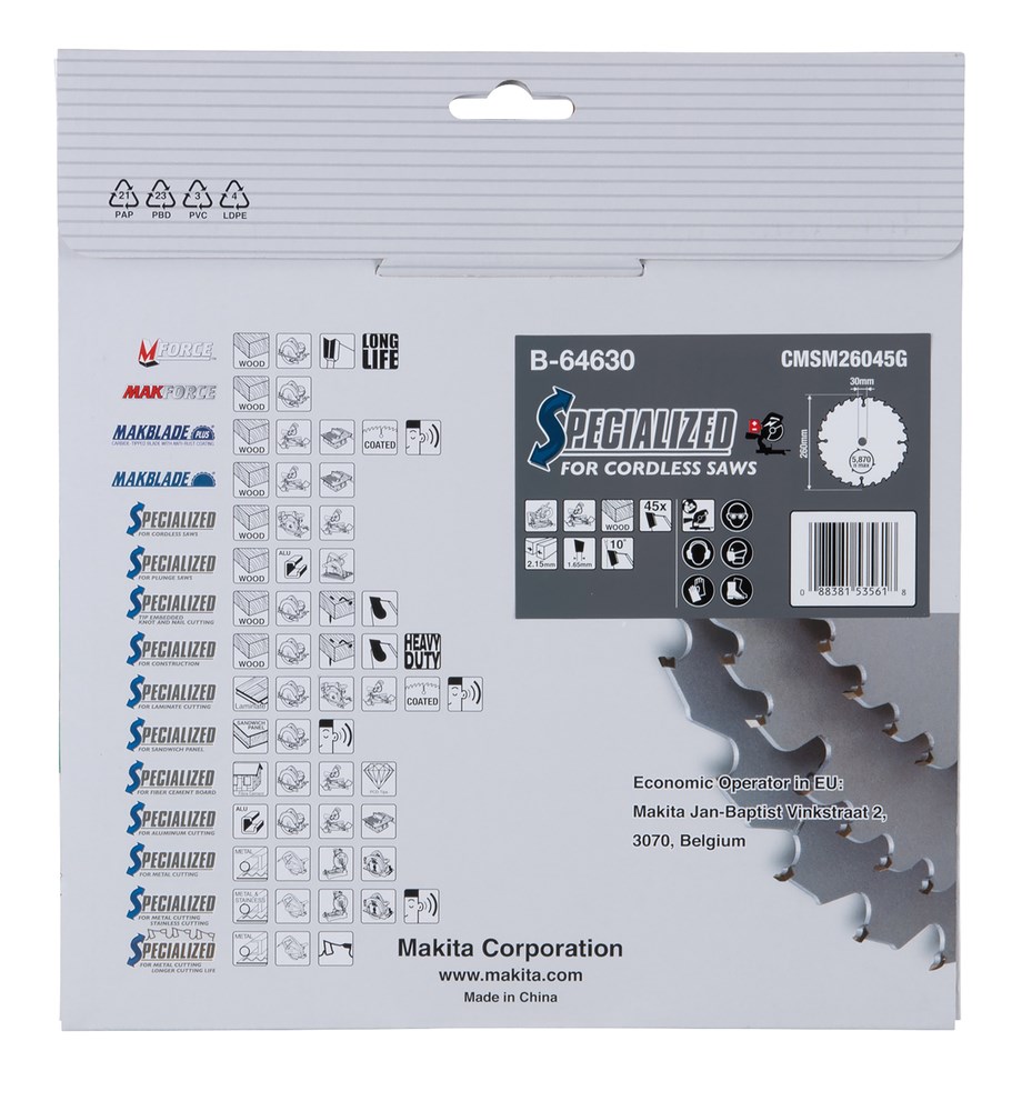 Contacteer onsMakita Artikelnummer: B-64630 TCT EFFICUT ZAAGBLAD 260MMX30X45T VOOR HOUT