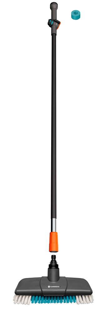 Contacteer onsDe GARDENA Cleansystem schoonmaakset met steel Hard is geschikt voor de reiniging van grotere, hardere vlakken, zoals tegelterrassen. In een handomdraai grote vlakken grondig schoonmaken De borstel en steel met watergeleiding en de reinigingstabs zijn ideaal om buiten iets schoon te maken. Terrassen, opritten, trappen en andere harde oppervlakken krijg je met deze schoonmaakset weer stralend schoon. Even klikken en de tuinslang zit aan de steel. De reinigingsborstel schroef je aan het uiteinde van de steel vast. De zeepring komt in het menggedeelte op de steel. Meer reikwijdte bij het schoonmaken De GARDENA steel M vergroot je werkbereik met 150 cm. De steel helpt je vooral om vloeren zonder te bukken schoon te maken, zodat je jouw rug niet belast. Om comfortabel te werken heeft de stevige steel van hoogwaardig aluminium een ommanteling, zodat hij zelfs bij lage buitentemperaturen niet koud aan voelt. Regelbare waterhoeveelheid voor een grondige schoonmaak Na aansluiten op je tuinslang kun je de waterstroom traploos regelen of dichtdraaien via de handgreep van de steel. De shampooringen steek je rechtstreeks in het menggedeelte op de steel. Het mengsel van water en shampoo breng je gedoseerd op het oppervlak aan. De mengkom is doorzichtig zodat je altijd kunt zien of de tabs al opgelost zijn. Schrobber voor harde ondergronden De steelborstel Hard met harde borstelharen is ontwikkeld om hardnekkig vuil snel en gemakkelijk van een harde ondergrond te halen. De borstel heeft haren van verschillende lengten voor een moeiteloze reiniging van harde vlakken, voegen en uitsparingen in stoepstenen waar andere borstels niet goed bij kunnen. Voor uitgebreid schoonmaken heb je een speciale vlakstraalsproeier en schraaprand, om hardnekkig vuil los te maken.