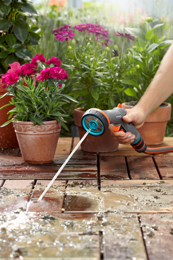 Contacteer onsDe GARDENA Comfort schoonmaakbroes is ideaal om krachtig te reinigen en om voorzichtig planten water te geven. Intensieve reiniging dankzij instelbare sproeipatronen De krachtige straal is ideaal voor het krachtig reinigen en losmaken van vuil op minder kwetsbare plekken. Zachte besproeiing van planten Ongeacht balkon, terras of tuin, dankzij de zachte sproeistraal kunt u potplanten, bloembedden en grotere delen van de tuin grondig en behoedzaam water geven. Waterhoeveelheid naar behoefte Dankzij de simpele bediening van de broes met één hand kunt u de waterstroom naar wens traploos doseren of helemaal dichtdraaien Zo kunt u besproeien en ook nog water besparen. Voor permanente besproeiing kunt u de impulstrekker vastzetten. U hoeft dan niet voortdurend weer de waterstraal in te schakelen zodat water geven een stuk makkelijker wordt. Robuust en duurzaam Dankzij de vorstbescherming vormen zelfs ijzige temperaturen geen probleem voor het spuitpistool. De zachte plastic ring op de kop beschermt tegen beschadigingen. Dit maakt het pistool zo duurzaam dat het zelfs in koude winters nog werkt. Eenvoudig te hanteren Dankzij de onderdelen van zachte kunststof ligt de sproeikop stevig en zeker in de hand. De ergonomische handgreep voorkomt wegglijden tijdens het besproeien of schoonmaken. De slangbroes is gemakkelijk met één hand te bedienen. Dankzij het kleine en compacte formaat ligt de broes bijzonder goed in de hand. Het ergonomische en functionele ontwerp zorgt bovendien voor veel comfort tijdens het besproeien van de tuinof schoonmaken.