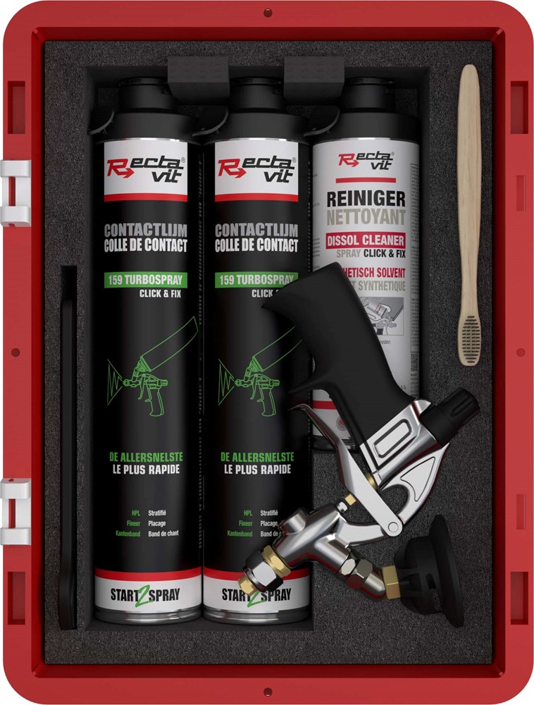 Contacteer onsCompleet starterspakket om aan de slag te gaan met de Rectavit Click & Fix verspuitbare contactlijm. Inhoud: 2 x 159 TurboSpray Click & Fix (750ml), 1 x Dissol Cleaner Spray (500ml), 1 x reinigingsborstel, 1 x moersleutel, 1 x spuitpistool Spray Gun.