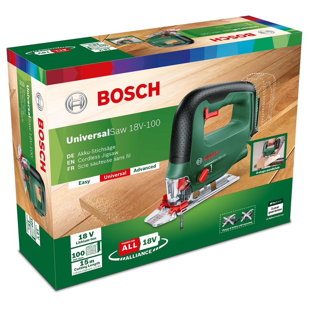 Echte allrounder voor veelzijdige zaagklussen Voor een keur aan zaagklussen in en om het huis, of het nu gaat om het zagen van parket of het maken van planken, de UniversalSaw 18V-100 op accu pakt het allemaal aan. Deze biedt een zaagdiepte van 100 mm in hout en max. 8 mm in staal en wordt geleverd met een assortiment handige accessoires. Deze decoupeerzaag levert met snelheid een topklus door een 4-traps pendelmechanisme dat het zaagblad zelfs door de hardste materialen duwt. Ervaren en beginnende doe-het-zelvers zullen de comfortabele, zachte aanloop en de instelbare toerentalregeling van de toerentalschakelaar weten te waarderen, evenals het SDS-systeem waarmee zaagbladen comfortabel en eenvoudig kunnen worden gewisseld. Het gereedschap maakt deel uit van de POWER FOR ALL ALLIANCE. Eén accu kan een groot aantal machines/apparaten van verschillende merken laten werken.