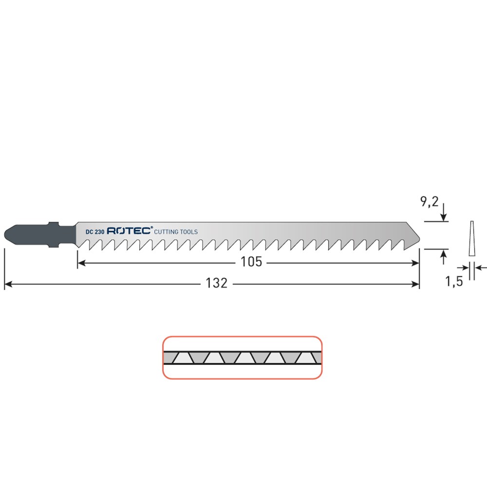 Alle houtsoorten en kunststof. Zuivere zaagsnede.