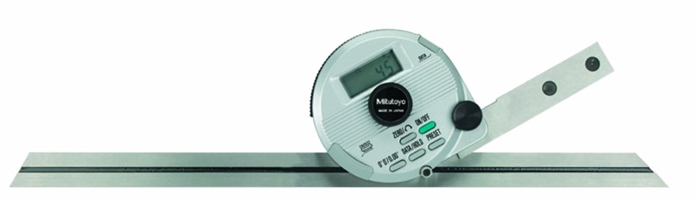 Een Mitutoyo digitale universele hoekmeter voor het nauwkeurig aflezen van hoeken op werkstukken, of het instellen van hoeken op bewerkingsmachines. Gehard roestvrijstalen constructie. Digimatic data uitgang.