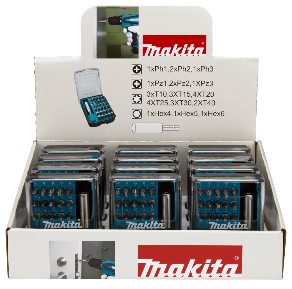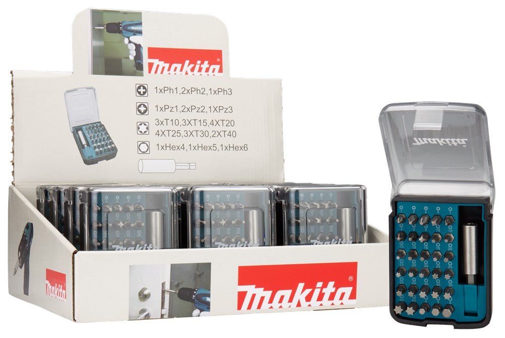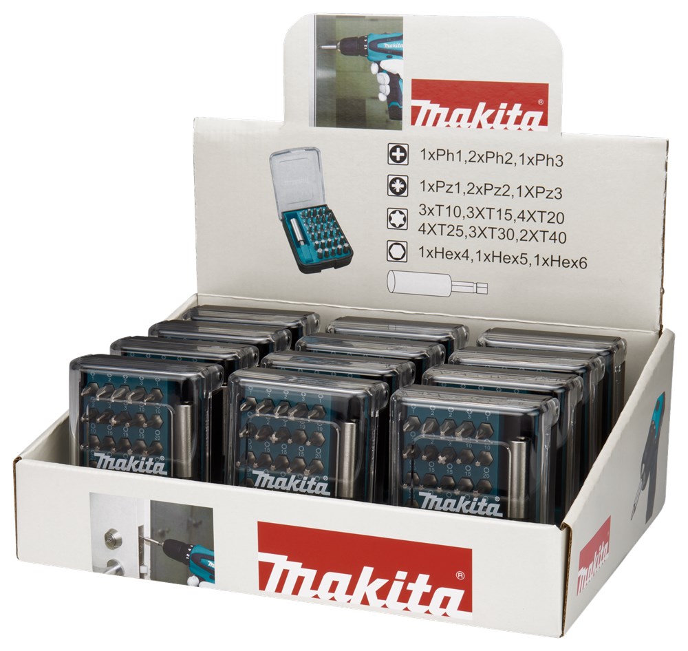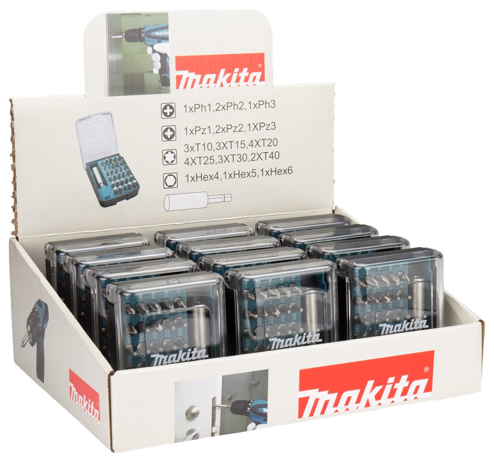 Contacteer onsMakita schroefbitsets en slagschroefbitsets, in verschillende samenstellingen. Kwalitatieve schroefbits in opbouw van Standaard, Impact Black en Impact Gold naar Impact Premier. 31-delige schroefbitset bestaande uit 30 schroefbits en magnetische bithouder, in handige kunststof meeneemverpakking met clip. Toonbankdisplay met 12 stuks D-34936.