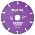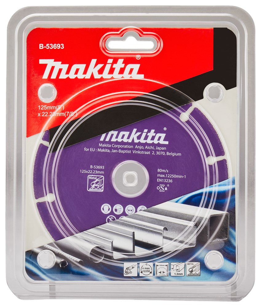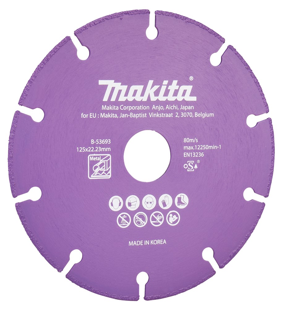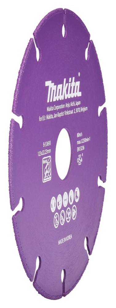 Makita 125 mm doorslijpschijf voor het doorslijpen van staal. Tevens geschikt voor PVC, gipsplaat, vezelmaterialen en glasvezel versterkt kunststof (GVK). De segmenten zijn voorzien van lasergelaste, hardmetalen korrels wat een hoge snijsnelheid oplevert en een lange levensduur garandeerd. We raden het sterk af in hout te slijpen. De kans op terugslag is vrij groot. Tevens kunnen er vonken in de stofzuiger komen wanneer je in hout met metaal/spijkers slijpt.