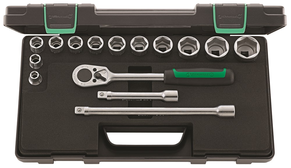 Contacteer onsIn kunststoffen doos, 15-delig, inhoud: 12 doppen, zeskant nr. 52: 10; 13; 16; 17; 18; 19; 21; 22; 24; 27; 30; 32 mm; 1 ratel nr. 512; 2 verlengstukken nr. 509/5 (130 mm), nr. 509/10 (255 mm).