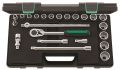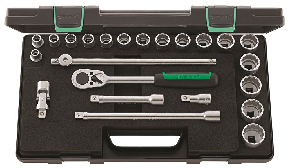 Contacteer onsIn kunststoffen doos, 23-delig, inhoud: 17 doppen, twaalfkant nr. 50a: 3/8; 7/16; 1/2; 9/16; 19/32; 5/8; 11/16; 3/4; 25/32; 13/16; 7/8; 15/16; 1; 1.1/16; 1.1/8; 1.3/16; 1.1/4"; 1 ratel nr. 512; 3 verlengstukken nr. 509/2 (52 mm), nr. 509/5 (130 mm), nr. 509/10 (255 mm); 1 hendel met schuifstuk nr. 506; 1 cardangewricht nr. 510.