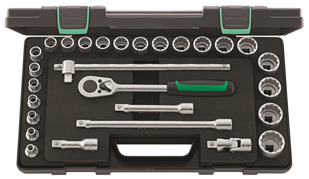 Contacteer onsIn kunststoffen doos, 28-delig, inhoud: 22 doppen, twaalfkant nr. 50: 8; 9; 10; 11; 12; 13; 14; 15; 16; 17; 18; 19; 20; 21; 22; 23; 24; 26; 27; 28; 30; 32 mm; 1 ratel nr. 512; 3 verlengstukken nr. 509/3 (75 mm), nr. 509/5 (130 mm), nr. 509/10 (255 mm); 1 hendel met schuifstuk nr. 506; 1 cardangewricht nr. 510.