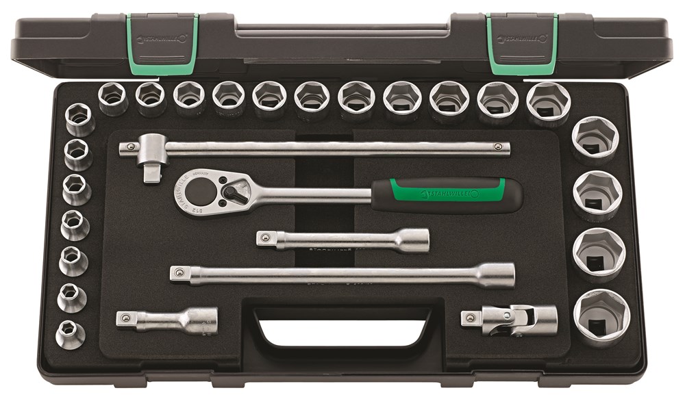 Contacteer onsIn kunststoffen doos, 28 delig, inhoud: 22 doppen, zeskant nr. 52: 8; 9; 10; 11; 12; 13; 14; 15; 16; 17; 18; 19; 20; 21; 22; 23; 24; 26; 27; 28; 30; 32 mm; 1 ratel nr. 512; 3 verlengstukken nr. 509/3 (75 mm), nr. 509/5 (130 mm), nr. 509/10 (255 mm); 1 hendel met schuifstuk nr. 506; 1 cardangewricht nr. 510.