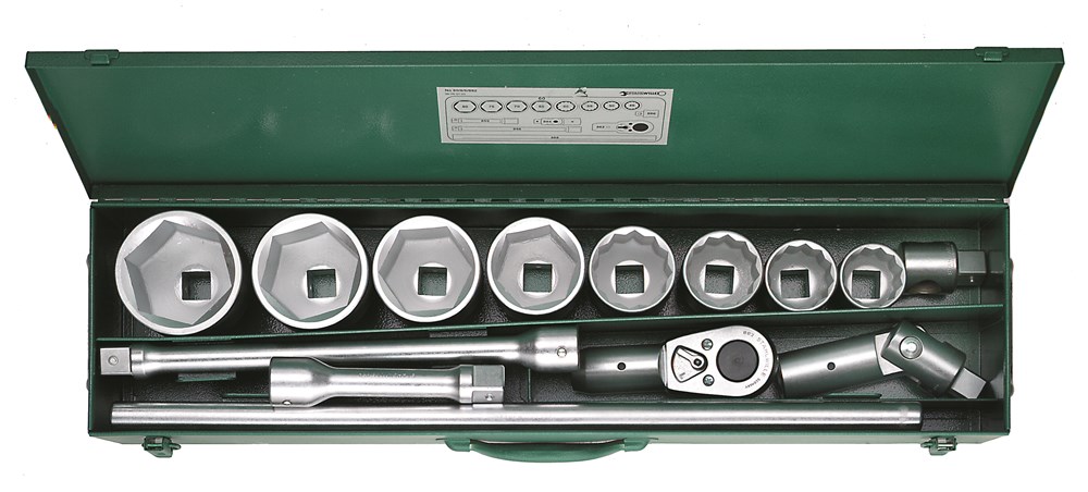 Contacteer onsIn metalen kist, 14-delig, inhoud: 4 doppen, twaalfkant nr. 60: 46; 50; 55; 60 mm; 4 doppen, zeskant nr. 60: 65; 70; 75; 80 mm; 1 ratelkop nr. 882; 2 verlengstukken nr. 859/8 (200 mm), nr. 859/16 (410 mm); 1 kniegewricht nr. 884; 1 schuifstuk nr. 886; 1 handgreep nr. 888.