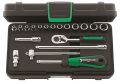 Contacteer onsIn kunststoffen doos, 19-delig, inhoud: 13 doppen, zeskant nr. 40: 3,5; 4; 4,5; 5; 5,5; 6; 7; 8; 9; 10; 11; 12; 13 mm; 1 ratel nr. 415; 2 verlengstukken nr. 405/2 (54 mm), nr. 405/6 (150 mm); 1 cardangewricht nr. 407; 1 steekhecht nr. 400; 1 hendel met schuifstuk nr. 404.