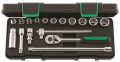 Contacteer onsIn kunststoffen doos, 17-delig, inhoud: 11 doppen, twaalfkant nr. 45a: 1/4; 5/16; 11/32; 3/8; 7/16; 1/2; 9/16; 5/8; 11/16; 3/4; 13/16"; 1 bougiedop, twaalfkant, lang, met beschermrubber, nr. 4600: 16 mm - 5/8"; 1 ratel nr. 435; 2 verlengstukken nr. 427/3 (76 mm), nr. 427/10 (240 mm); 1 hendel met schuifstuk nr. 425; 1 cardangewricht nr. 428.
