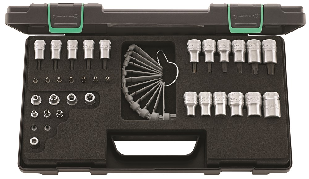 Contacteer onsIn kunststoffen doos, 35-delig. Inhoud: 3 doppen voor uitwendige TORX®-bouten nr. 40TX: gr. E4; E5; E6; 2 schroevendraaierdoppen voor inwendige TORX®-bouten nr. 44KTX: gr. T8; T9; 4 doppen voor uitwendige TORX®-bouten nr. 45TX: gr. E7; E8; E10; E12; 5 schroevendraaierdoppen voor inwendige TORX®-bouten nr. 49TX: gr. T10; T15; T20; T25; T27; 6 doppen voor uitwendige TORX®-bouten nr. 50TX: gr. E11; E14; E16; E18; E20; E24; 6 schroevendraaierdoppen voor inwendige TORX®-bouten nr. 54TX: gr. T30; T40; T45; T50; T55; T60; 7 schroevendraaierbits voor inwendige TORX®-bouten met boorgat nr. 1440: T10, nr. 1441: T15, nr. 1442: T20, nr. 1443: T25, nr. 1444: T27, nr. 1445: T30, nr. 1446: T40; 1 bithouder nr. 442; 1 TORX®-kaliber: gr. E6; E7; E8; E10; E12; E14; E16; T10; T15; T20; T25; T27; T30; T40; T45; T47; T50; T55; T60.