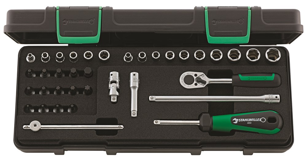 Contacteer onsIn kunststoffen doos, 36-delig. Inhoud: 10 doppen, zeskant nr. 40: SW 5; 5,5; 6; 7; 8; 9; 10; 11; 12; 13 mm; 6 doppen voor uitwendige TORX®-bouten nr. 40TX: gr. E4; E5; E6; E7; E8; E10; 5 inbusdoppen nr. 44K: SW 3; 4; 5; 6; 8 mm; 9 schroevendraaierdoppen voor inwendige TORX®-bouten nr. 44KTX: gr. T8; T9; T10; T15; T20; T25; T27; T30; T40; 1 ratel nr. 415; 2 verlengstukken nr. 405/2 (54 mm), nr. 405/6 (150 mm); 1 cardangewricht nr. 407; 1 steekhecht nr. 400; 1 hendel met schuifstuk nr. 404.